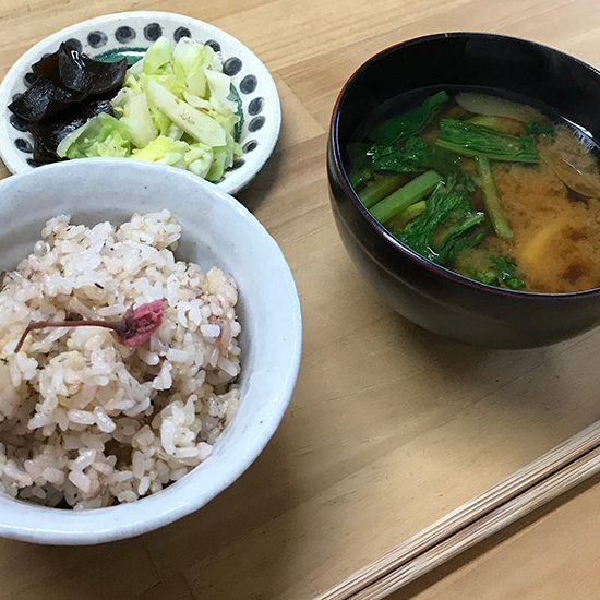 ごはんは塩付けサクラの花の炊き込みご飯、小松菜ネギワカメのお味噌汁、キャベツのお漬物昆布の佃煮でした。